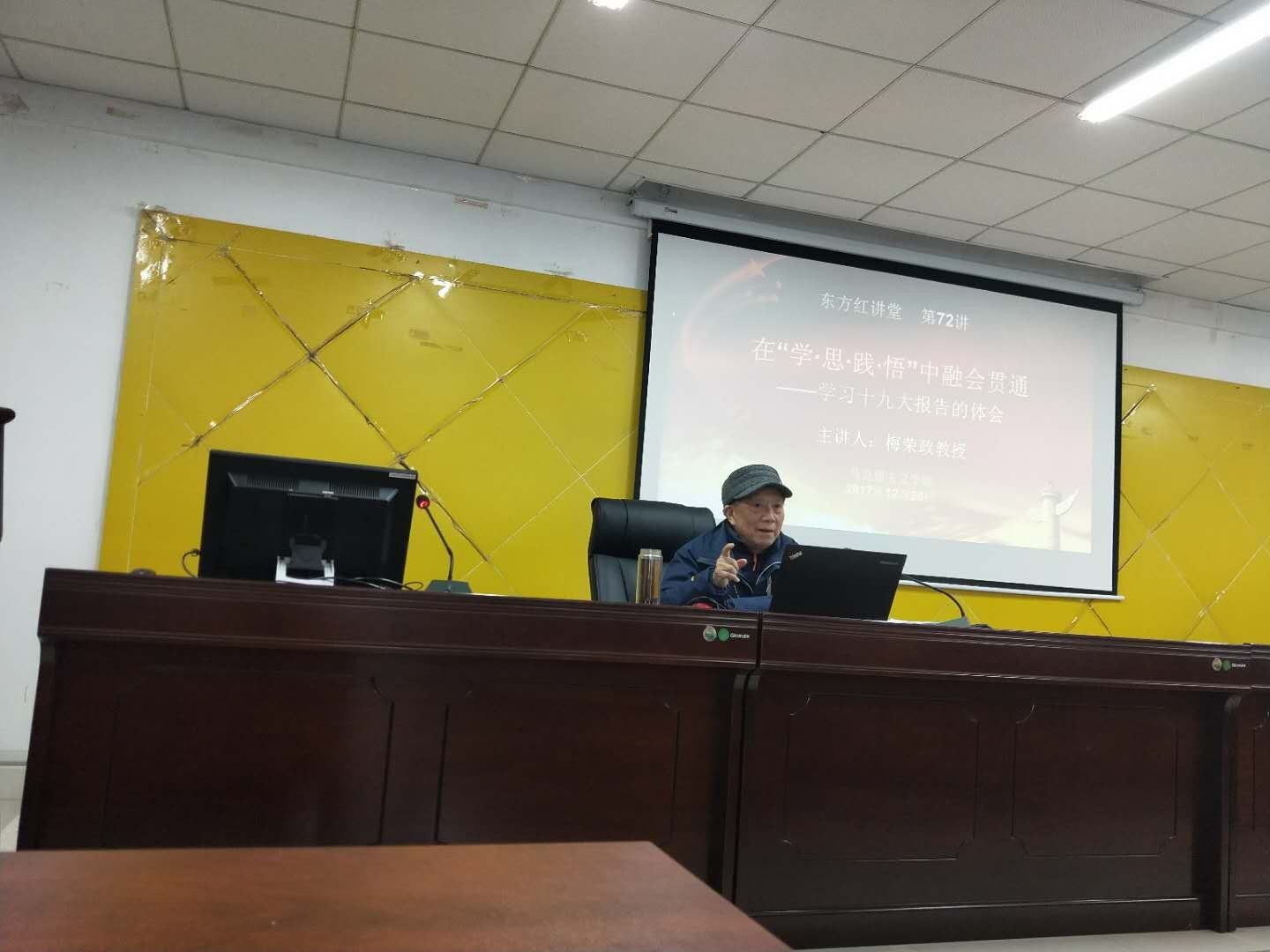 之后,梅教授正式开始讲座。讲座分为“举旗抓纲、把握报告的整体精神”,“对中国特色社会主义进入新时代这一重大判断的看法”,“从‘五学’着手,学习十九大报告”等三大部分。