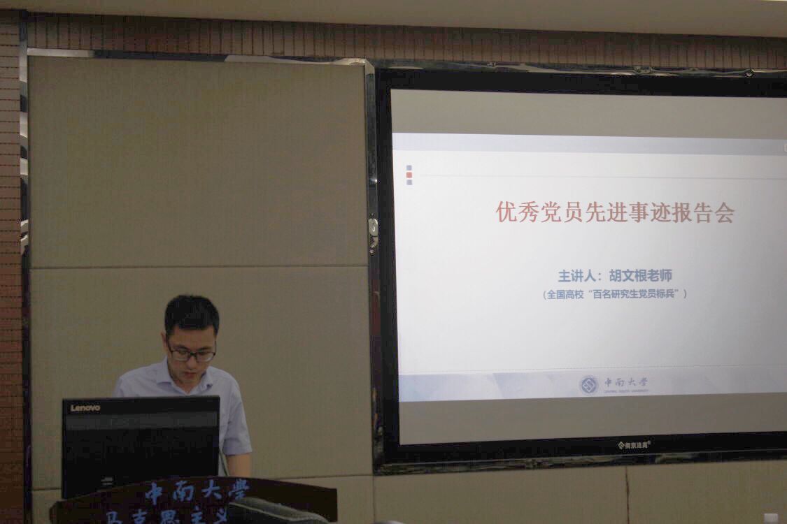紧接着,优秀党员代表胡文根老师分享了他在中南大学美高梅MGM电子娱乐游戏本硕博期间的成长与收获,报告始终围绕“奋斗的青春与青春的奋斗”这一主题,有温度、有深度,令人受益匪浅。他说:“青春的价值不是凭空而来,奋斗才是最亮的底色,奋斗使自我与国家彰显出最大的意义”。他结合自身的学术与实践经历,向大家阐释了文科专业的学生应该如何学习与奋斗,马院的学生如何在看似无用的专业当中探寻有用之学。11年的时间,14篇c刊的发表,调研意见纳入省政府决策意见……马克思主义不仅仅致力于科学的解释世界而且致力于科学的改造世界,他证明了什么才是知行合一,经世致用。最后,他提醒在座党员在泛娱乐化的社会环境中,要不忘初心,潜心学术,并分享了一句话给广大党员“我们在这个时代挣脱的只是枷锁,获得的将是整个世界”。